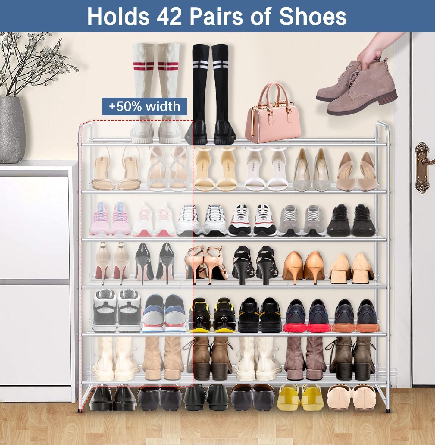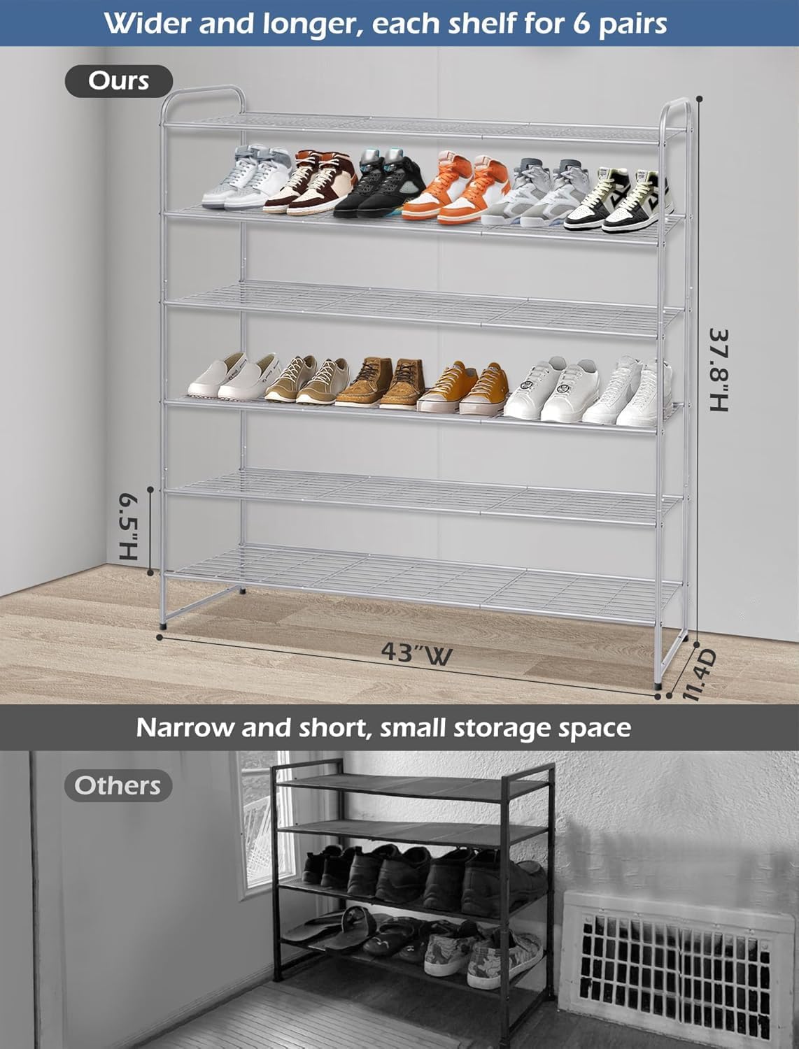 【 Large Capacity, Holds 42 Pairs of Shoes】 long shoe rack can store 42 pairs of shoes totally, easy to holds up 6 pairs of men's tennis shoes, sneakers, women boots per rack. The extra bottom space is enough to place daily wear flats, slippers, size is 11.4"D x 43"W x 37.8"H