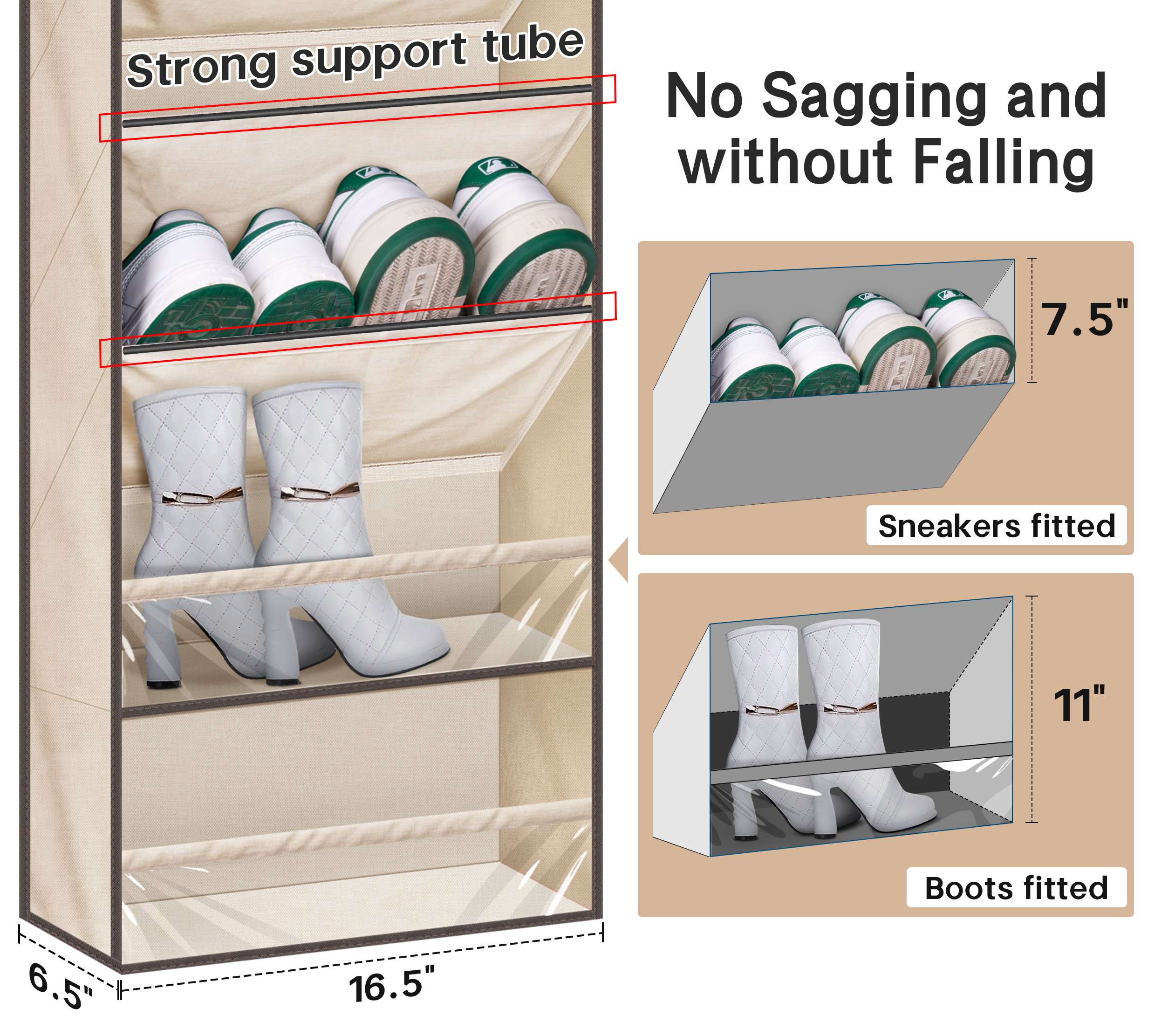 【Fit Big Size Men's Shoes】: Different size spaces fit different shoes. The over the door shoe rack's above 6 layers can hold men’s size 14 or women’s high heels. The bottom 2 layers can hold women's boots or 12 pairs of kid's sneakers