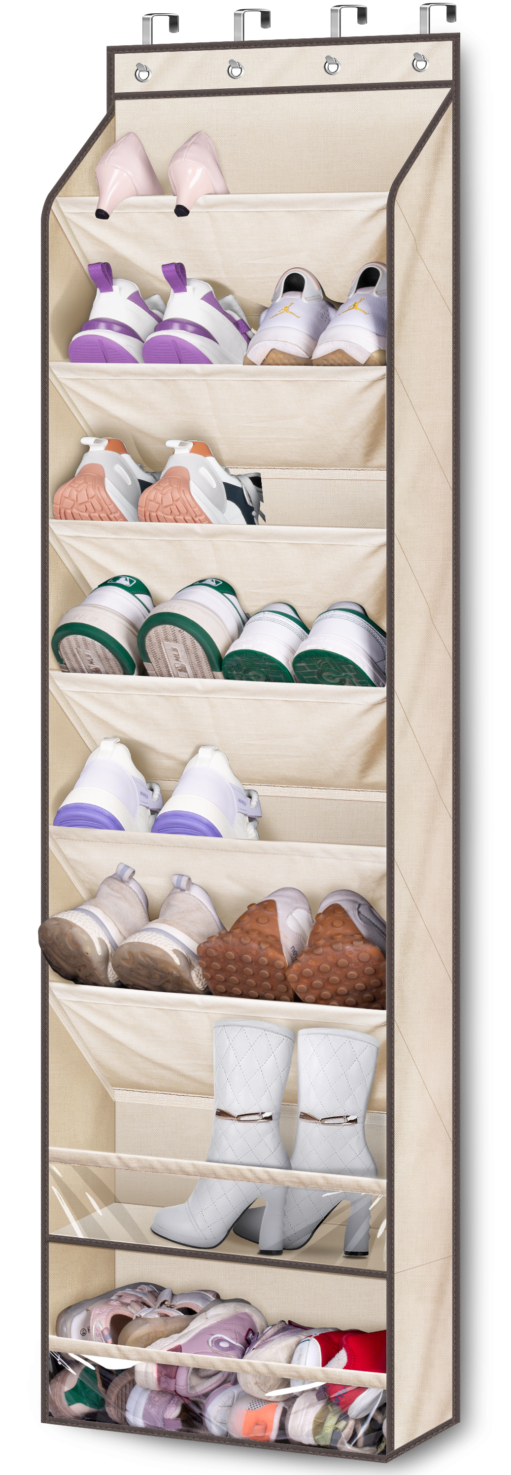 【Narrow Door Fitted】: The shoe rack for closet door fits most home door and narrow door, closet door, 4 heavy duty metal hooks can hold up to 50lbs. The hanging shoe storage fits home door(1.37"-1.65")